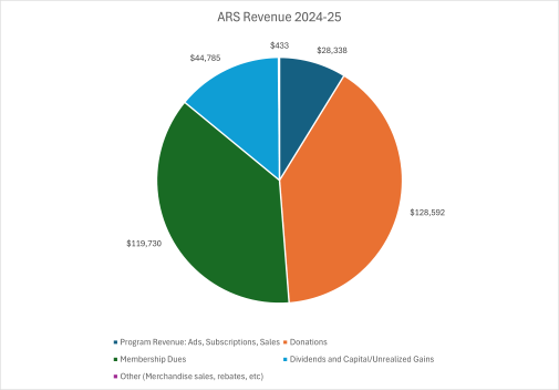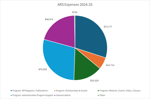 The next item of business included ARS revenue and expenses (see pie charts, which will also be published in AR magazine). While ARS membership dues account for much of our income, member donations exceeded this amount and allowed the ARS to fund existing programs while offering both new and one-time projects.